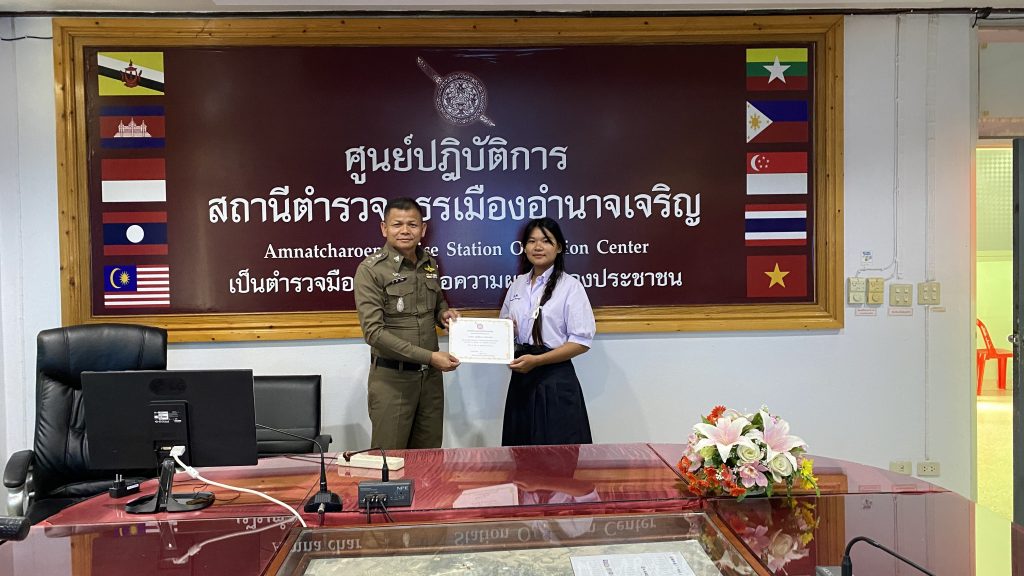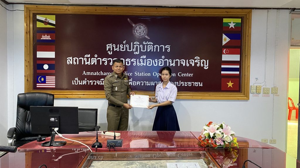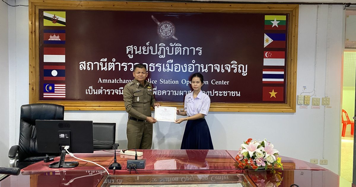 พ.ต.อ.สุพล ร่วมสุข ผกก.สภ.เมืองอำนาจเจริญ ได้มอบใบเกียรติบัตรให้กับนักเรียนโรงเรียนนาจิกพิทยาคม